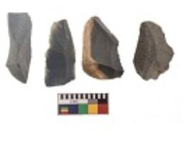 | Description / विवरण | There are n 4 utilized flakes. There are multi directional irregular scar pattern on both dorsal and ventral face of the flakes. Three are tapering at one end and one has sharp edge. |