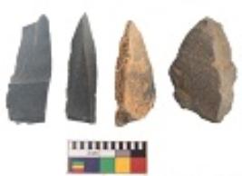 | Description / विवरण | There are n 4 utilized flakes. There are multi directional irregular scar pattern on both dorsal and ventral face of the flakes. One is tapering at one end and three have sharp edges. |