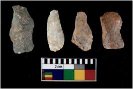 | Description / विवरण | There are n 4 utilized flake cores. Out of them three are made up of Chalcedony and one is made up of Chert. There are multi directional irregular scar pattern on them. All of them are tapering at one end. |