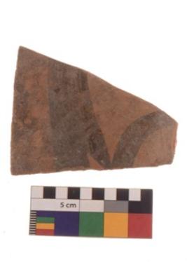 | Description / विवरण | Specimen of a Potsherd with black decorative geometric painting on it. It have group of oblique lines set two horizontal bands |