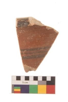 | Description / विवरण | Specimen of black on red ware with decorative geometric Three parallel lines painting. |