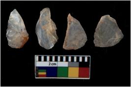 | Description / विवरण | There are n 4 utilized flake cores. There are multi directional irregular scar pattern on them. One is tapering at one end and three have sharp edges. |