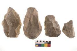 | Description / विवरण | There are n 4 of utilized worked cores and show irregular scar pattern on both dorsal and ventral side. Three are tapering at one end and two have a flat base. |