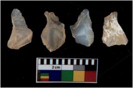 | Description / विवरण | There are n 4 utilized flake cores. There are multi directional irregular scar pattern on them. All of them are tapering at one end. |