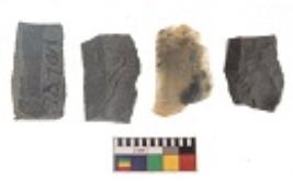 | Description / विवरण | There are n 4 utilized flakes. There are multi directional irregular scar pattern on both dorsal and ventral face of the flakes. Three are tapering at one end and one has blunted edges. |