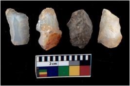 | Description / विवरण | There are n 4 utilized flake cores. Out of them three are made up of Chalcedony and one is made up of Chert. There are multi directional irregular scar pattern on them. All of them are tapering at one end. |