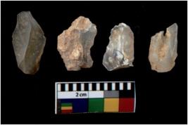 | Description / विवरण | There are n 4 utilized flake cores. There are multi directional irregular scar pattern on them. One is tapering at one end and three have sharp edges. |