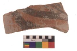 | Description / विवरण | Specimen of a Potsherd with black decorative geometric painting on it. It have group of oblique lines set two horizontal bands |