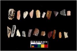 | Description / विवरण | Specimen of flakes tool with prominent flaking marks. It made up of a short flakes with sides trimmed. |