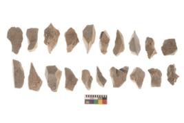 | Description / विवरण | There are n 20 utilized flakes. There are multi directional irregular scar pattern on both dorsal and ventral face of the flakes. Among them few have tapering edges, and few have broken tip. |