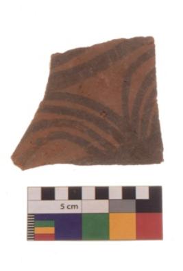 | Description / विवरण | Specimen of a Potsherd with black decorative geometric painting on it. It have group of oblique lines set two horizontal bands. |