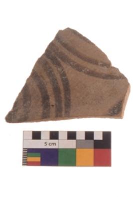 | Description / विवरण | Specimen of a Potsherd with black decorative geometric painting on it. It have group of oblique lines set two horizontal bands. |