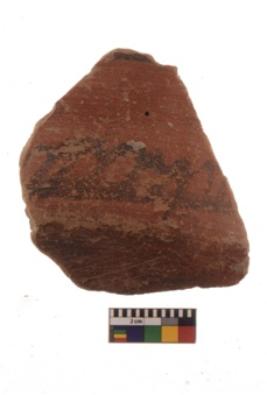 | Description / विवरण | Specimen of a Potsherd with black decorative geometric painting on it. The potsherd is decorated with two horizontal bands |