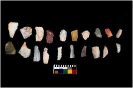| Description / विवरण | Specimen of flakes tool with prominent flaking marks. It made up of a short flakes with sides trimmed. |
