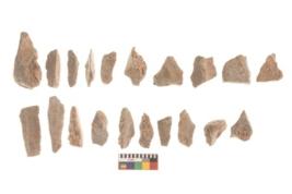 | Description / विवरण | There are n 20 utilized flakes. There are multi directional irregular scar pattern on both dorsal and ventral face of the flakes. Among them most of them have tapering edges, and few have flat base edges. |