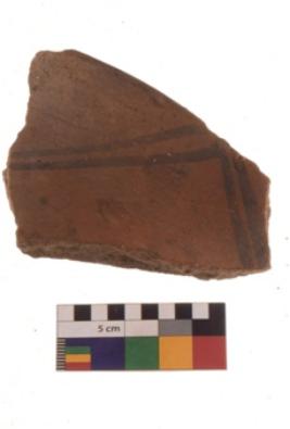 | Description / विवरण | Specimen of Potsherd black on red painted pottery. It is fine fabric in sharp contrast with painted design are executed in black pigment. |