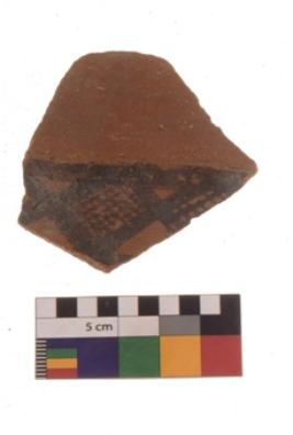 | Description / विवरण | Specimen of Potsherd with black decorative geometric diamond set broad horizontal bands painting. |