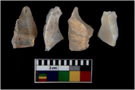| Description / विवरण | There are n 4 utilized flake cores. There are multi directional irregular scar pattern on them. Three are tapering at one end and one has sharp edge. |
