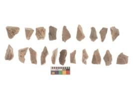 | Description / विवरण | There are n 20 utilized flakes. There are multi directional irregular scar pattern on both dorsal and ventral face of the flakes. Among them most of them have sharp edges, and few have broken tip. |