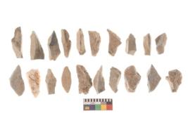 | Description / विवरण | There are n 20 utilized flakes. There are multi directional irregular scar pattern on both dorsal and ventral face of the flakes. Among them most of them have tapering edges, and few have broken tip. |