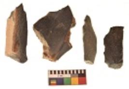 | Description / विवरण | There are n 4 utilized flakes. There are multi directional irregular scar pattern on both dorsal and ventral face of the flakes. One is tapering at one end and three have sharp edges. |