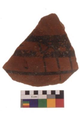 | Description / विवरण | Specimen of Potsherd with black decorative geometric diamond set broad horizontal bands painting .It have latticed diamond set broad horizontal bands, but having group of oblique line at intervals |