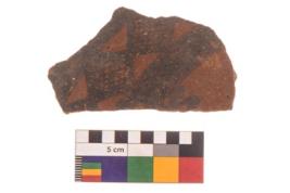| Description / विवरण | Specimen of Potsherd with black decorative geometric diamond set broad horizontal bands painting. |