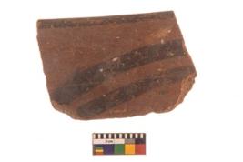 | Description / विवरण | Specimen of Potsherd black on red painted pottery. It is fine fabric in sharp contrast with painted design are executed in black pigment. |