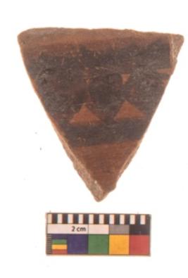 | Description / विवरण | Specimen of Potsherd with black decorative geometric diamond set broad horizontal bands painting. |