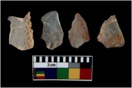| Description / विवरण | There are n 4 utilized flake cores. There are multi directional irregular scar pattern on them. Three are tapering at one end and one has sharp edge. |