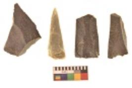 | Description / विवरण | There are n 4 utilized flakes. There are multi directional irregular scar pattern on both dorsal and ventral face of the flakes. Two are tapering at one end and two have sharp edges. |