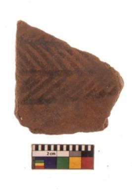 | Description / विवरण | Specimen of pipal leaf disign on exterior of thin coarse Red ware potsherd. |