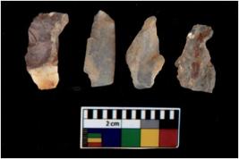 | Description / विवरण | There are n 4 utilized flake cores. Out of them three are made up of Chalcedony and one is made up of Chert. There are multi directional irregular scar pattern on them. All of them are tapering at one end. |