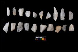 | Description / विवरण | Specimen of flakes tool with prominent flaking marks. It made up of a short flakes with sides trimmed. |