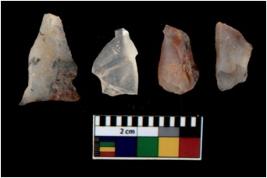 | Description / विवरण | There are n 4 utilized flake cores. There are multi directional irregular scar pattern on them. All of them are tapering at one end. |