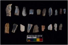 | Description / विवरण | Specimen of flakes tool with prominent flaking marks. It made up of a short flakes with sides trimmed. |