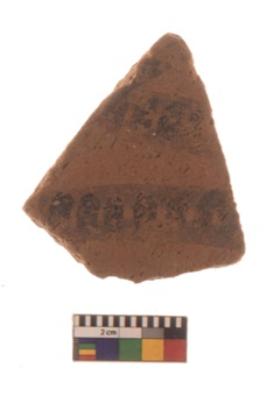 | Description / विवरण | Specimen of Potsherd black on red painted pottery. It is fine fabric in sharp contrast with painted design are executed in black pigment. |