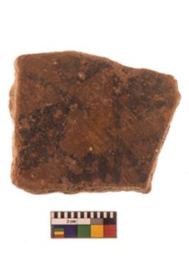 | Description / विवरण | Specimen of Potsherd with black decorative geometric diamond set broad horizontal bands painting. |