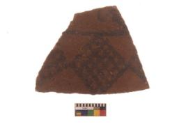 | Description / विवरण | Specimen of Potsherd with black decorative geometric diamond set broad horizontal bands painting. |
