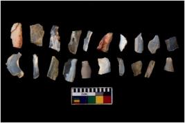 | Description / विवरण | Specimen of flakes tool with prominent flaking marks. It made up of a short flakes with sides trimmed. |