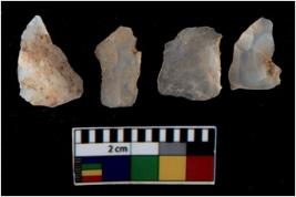 | Description / विवरण | There are n 4 utilized flake cores. There are multi directional irregular scar pattern on them. One is tapering at one end and three have blunted edges. |
