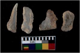 | Description / विवरण | There are n 4 utilized flake cores. There are multi directional irregular scar pattern on them. All of them are tapering at one end. |