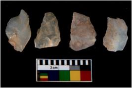 | Description / विवरण | There are n 4 utilized flake cores. There are multi directional irregular scar pattern on them. All of them are tapering at one end. |