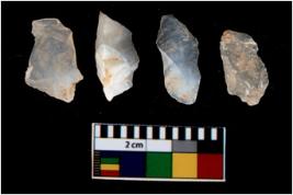 | Description / विवरण | There are n 4 utilized flake cores. There are multi directional irregular scar pattern on them. Two are tapering at one end and two have sharp edges. |