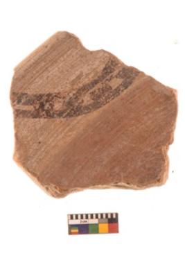 | Description / विवरण | Specimen of Potsherd black on red painted pottery. It is fine fabric in sharp contrast with painted design are executed in black pigment. |