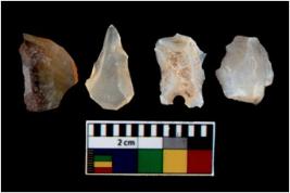 | Description / विवरण | There are n 4 utilized flake cores. There are multi directional irregular scar pattern on them. Three are tapering at one end and one has sharp edge. |