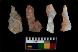 | Description / विवरण | There are n 4 utilized flake cores. There are multi directional irregular scar pattern on them. Three are tapering at one end and one has sharp edge. |