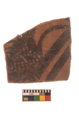 | Description / विवरण | Specimen of Potsherd with black decorative geometric diamond set broad horizontal bands painting .It have latticed diamond set broad horizontal bands, but having group of oblique line at intervals |