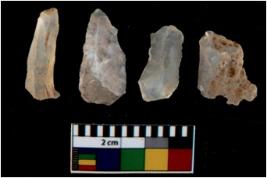 | Description / विवरण | There are n 4 utilized flake cores. There are multi directional irregular scar pattern on them. All of them are tapering at one end. |