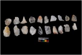 | Description / विवरण | Specimen of flakes tool with prominent flaking marks. It made up of a short flakes with sides trimmed. |